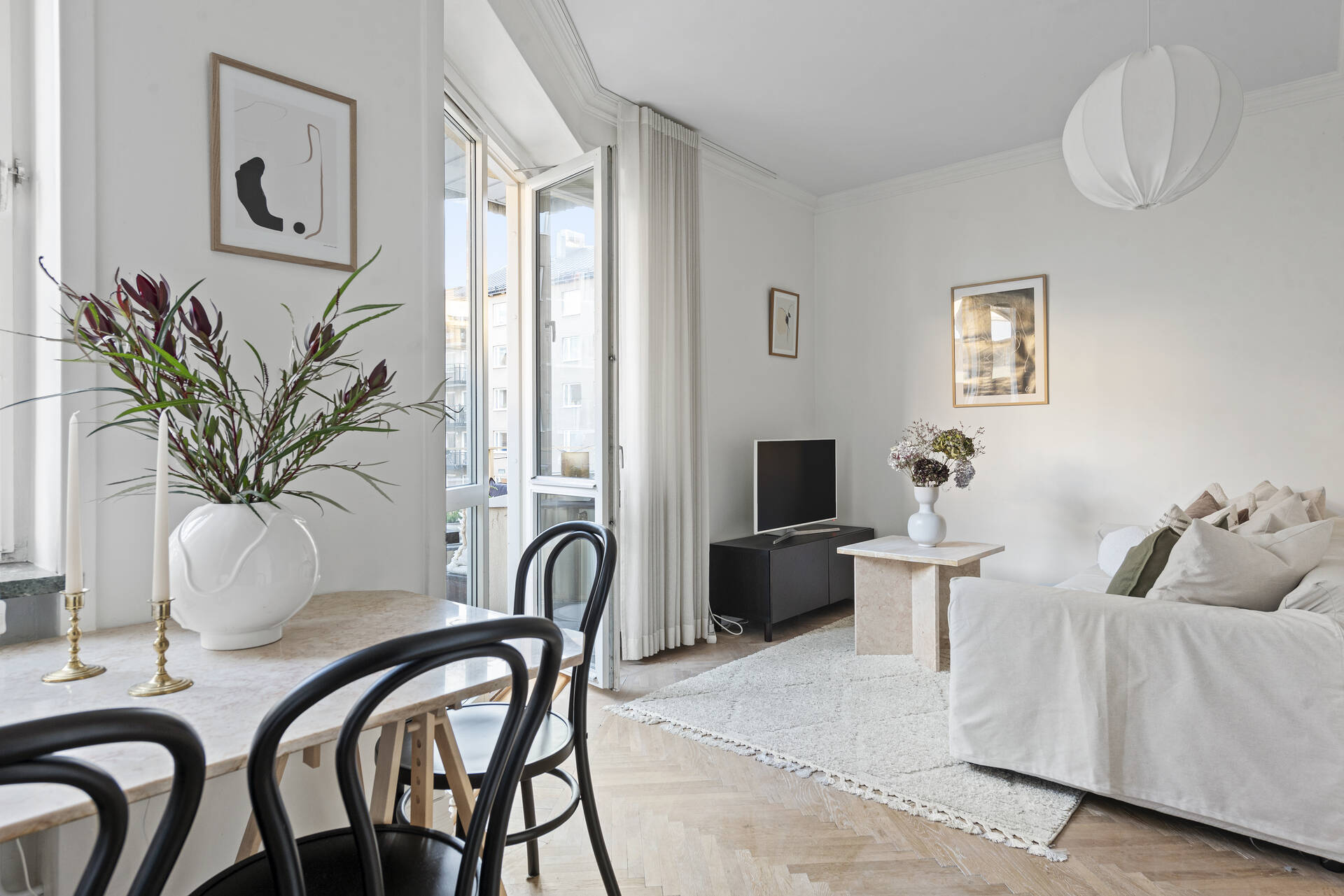 Välkomna till denna ljusa och stiliga bostad, där varje detalj är noggrant utvald för att skapa en trivsam och funktionell hemmiljö. Den rymliga hallen med sina stora garderober ger ett första intryck av praktisk förvaring och stil. Den vackra fiskbensparketten löper genom hela lägenheten och ger en tidlös charm, medan köket har ett klassiskt trägolv. Det sociala vardagsrummet erbjuder gott om plats för både avkoppling och samvaro, med en smart uppdelning som ger en mysig sovdel avskärmad med en elegant vit vägg med glaspartier. Ljuset flödar in genom fönstren och från vardagsrummet når du den härliga balkongen som vetter mot en lugn innergård – den perfekta platsen för morgonkaffe eller avkoppling. Måste upplevas på plats! Varmt välkommen på visning.