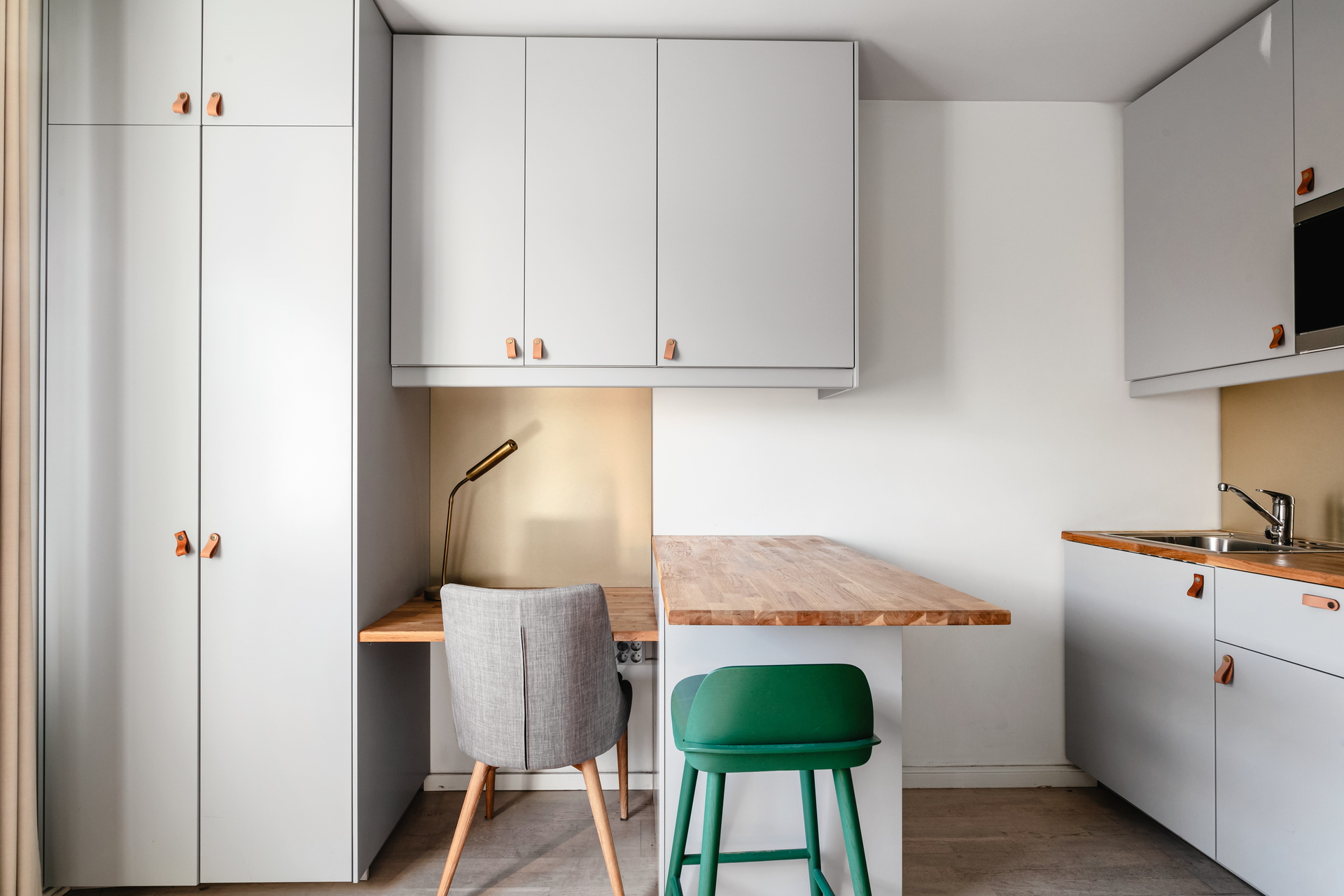 Juridisk person accepteras! Mycket trevlig lägenhet där allt det nödvändiga får plats. Ljust rum stort fönster, rejäl köksdel, matplats, kyl med frysfack, micro, diskmaskin och vattenkokare. Platsbyggd skrivbordsdel och garderob samt sovdel med bred säng. 160 cm bred säng i sovalkov. Helkaklat badrum med badkar & dusch. Lägenheten präglas av en stilren skandinavisk design. Som ett eget hotellrum där du även kan hyra ut fritt via hotelloperatören i huset när du själv inte är incheckad.
