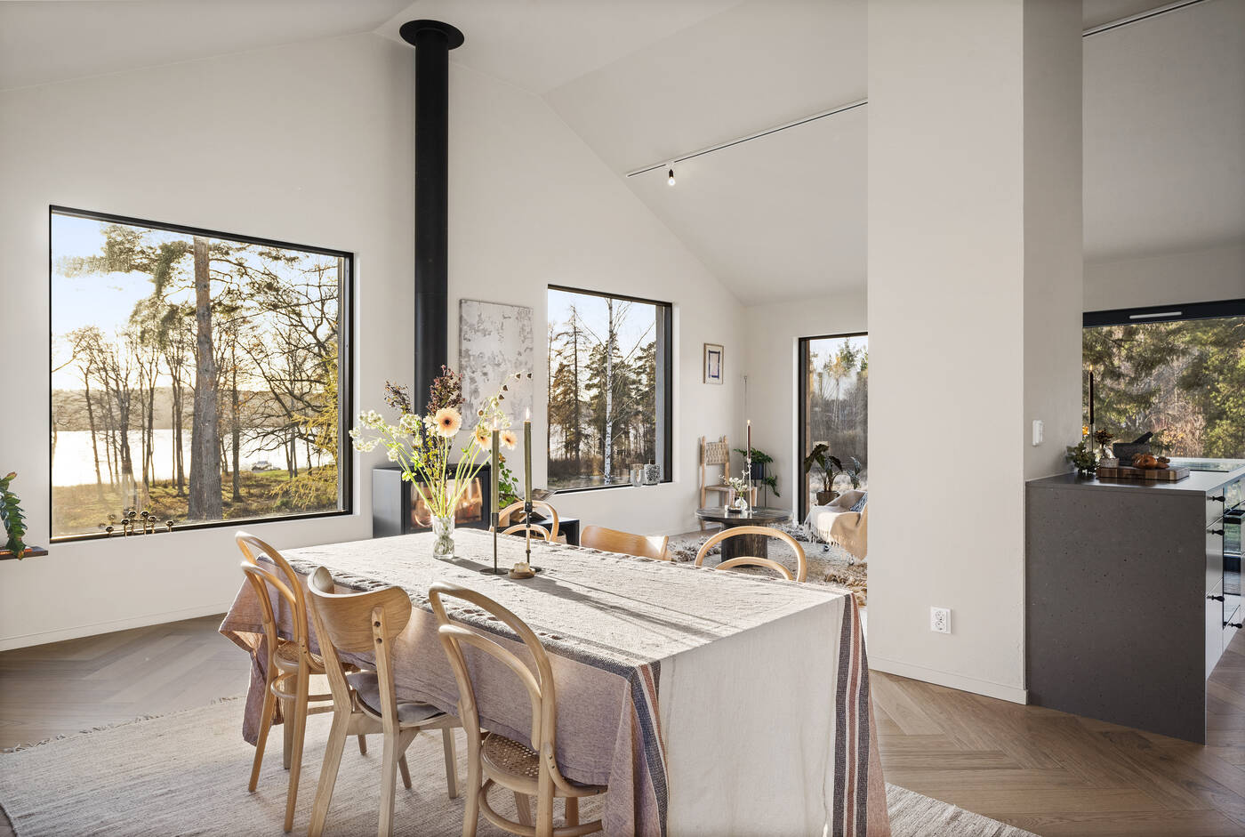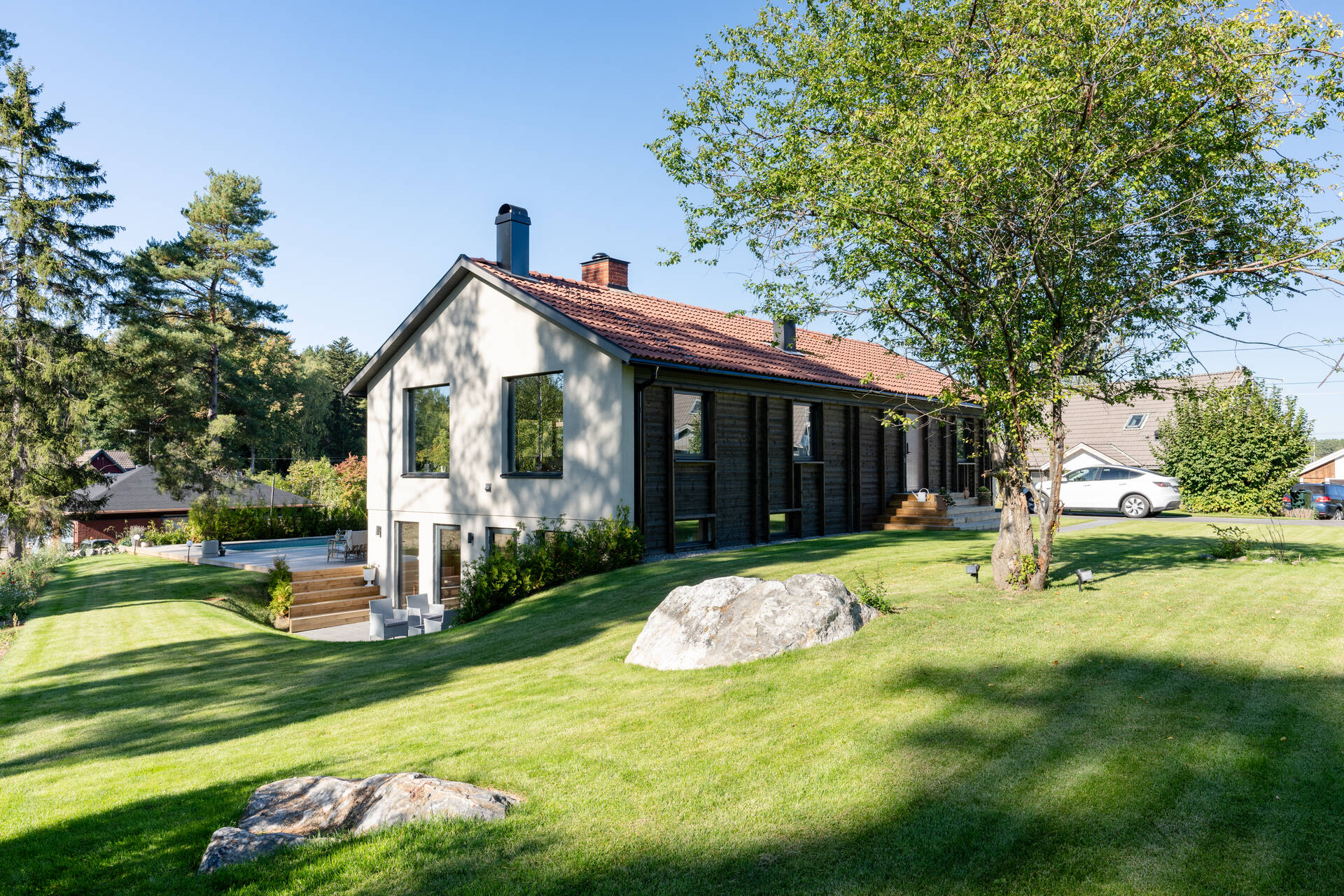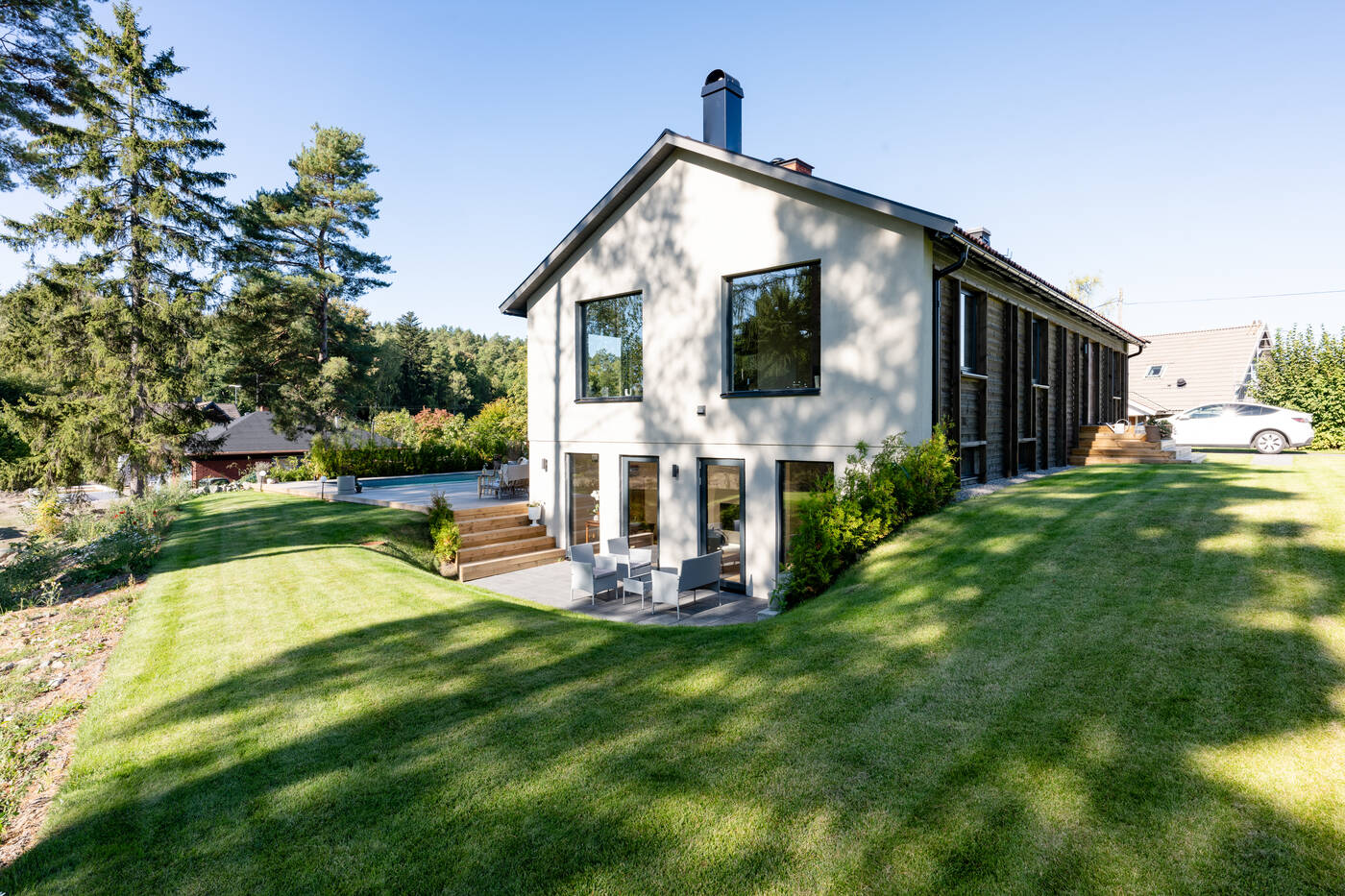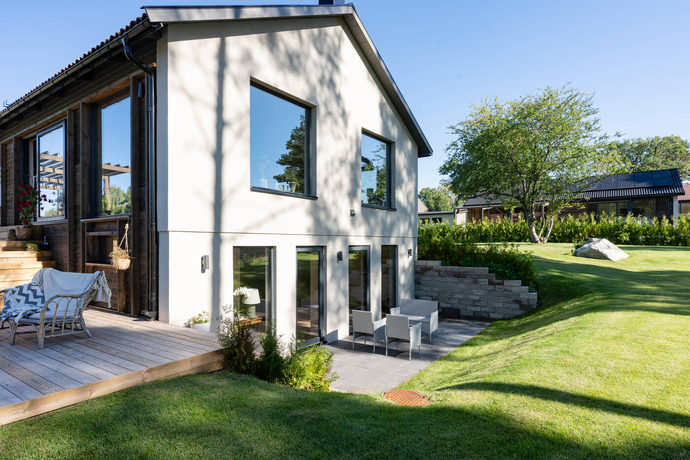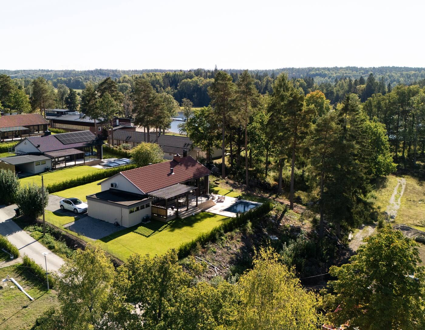 Välkommen till detta exklusiva arkitektritade hus som har renoveras under 2024 med magisk sjöutsikt, egen båtplats, pool & fristående garage. Friköpt hus i två plan med totalyta om 225 kvm, stor plan tomt på 1044 kvm med grönskande växter & träd. Huset erbjuder påkostade materialval och genomtänkta detaljer för en modern känsla där villan fått ett helt nytt liv i en exklusiv design. Njut av ett familjärt boende med tanken på att leva ett liv med bekvämligheter. Här finns det mesta man kan önska sig, som fyra sovrum (möjlighet att skapa ett femte), två badrum, gästwc, tvättstuga, ett stort kök med vacker sjöutsikt, högt i tak, härligt ljus genom generösa glaspartier som skapar den när känslan av att leva nära naturen. Härifrån finns det utgång till stora trädäcket där poolen ligger vackert med storslagen utsikt. Vardagsrum finns på bägge våningsplanen med vacker sjöutsikt, härligt ljus genom stora fönster, mysiga braskaminer samt altandörrar mot altanen och trädgården som skapar en harmonisk känsla av inomhus och utomhus. Det finns gott om parkeringsutrymme, fristående garage med laddningsstation för elbil och generöst med förrådsutrymmen.