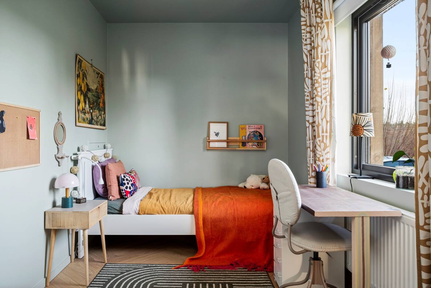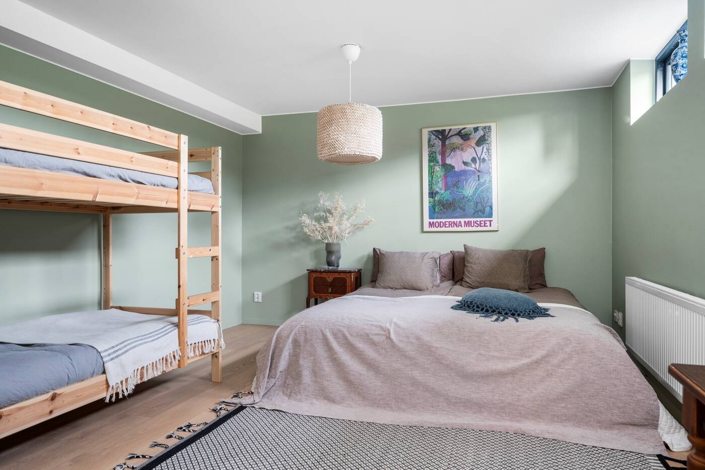 Trevligt och trivsamt sovrum med gott om plats för en stor dubbelsäng och övrig möblering som önskas. Fint ljusinsläpp flödar in genom fönstret. Här är väggar målade i en fin behaglig grön kulör.