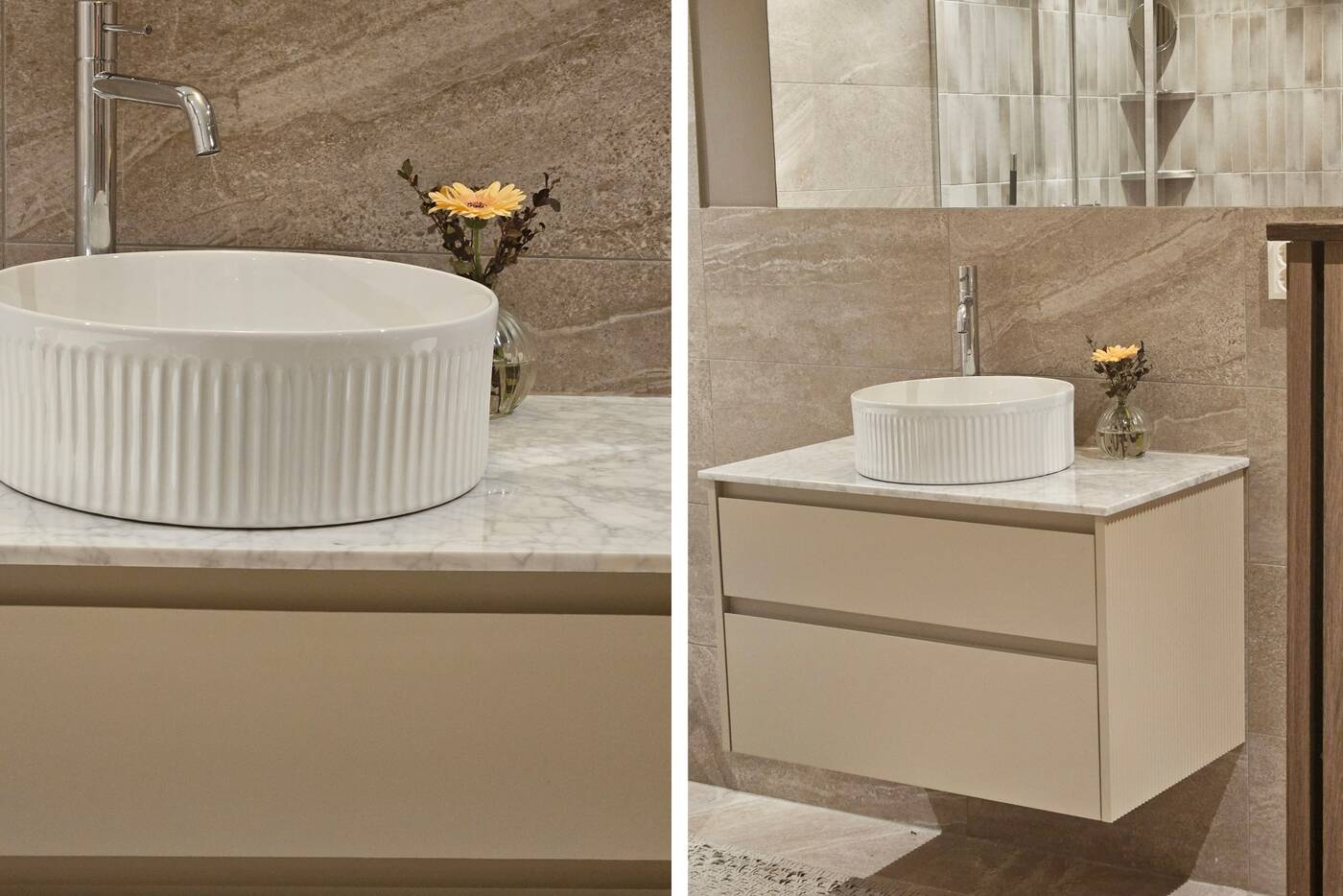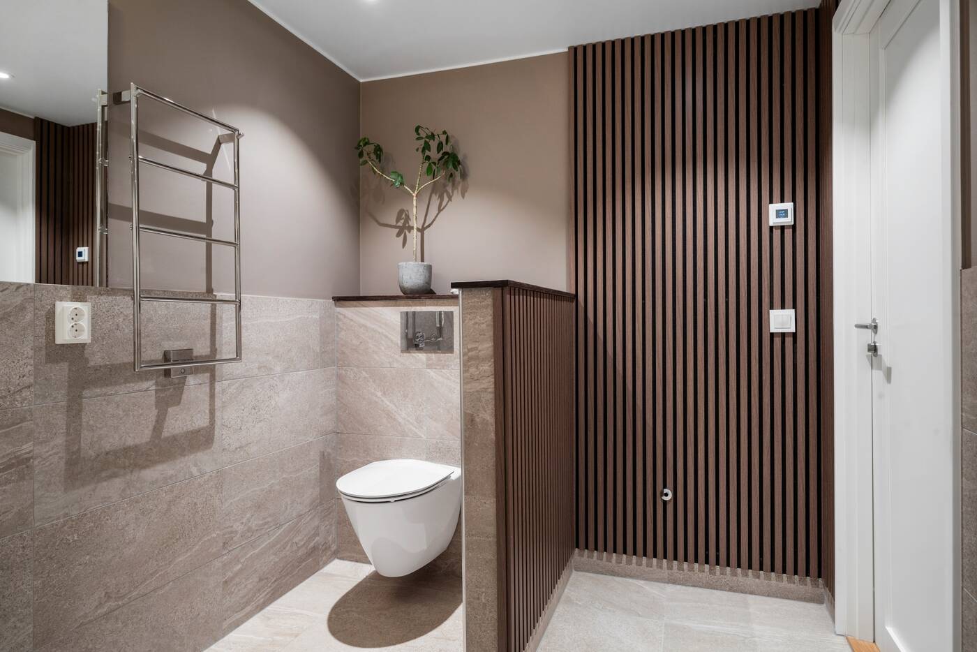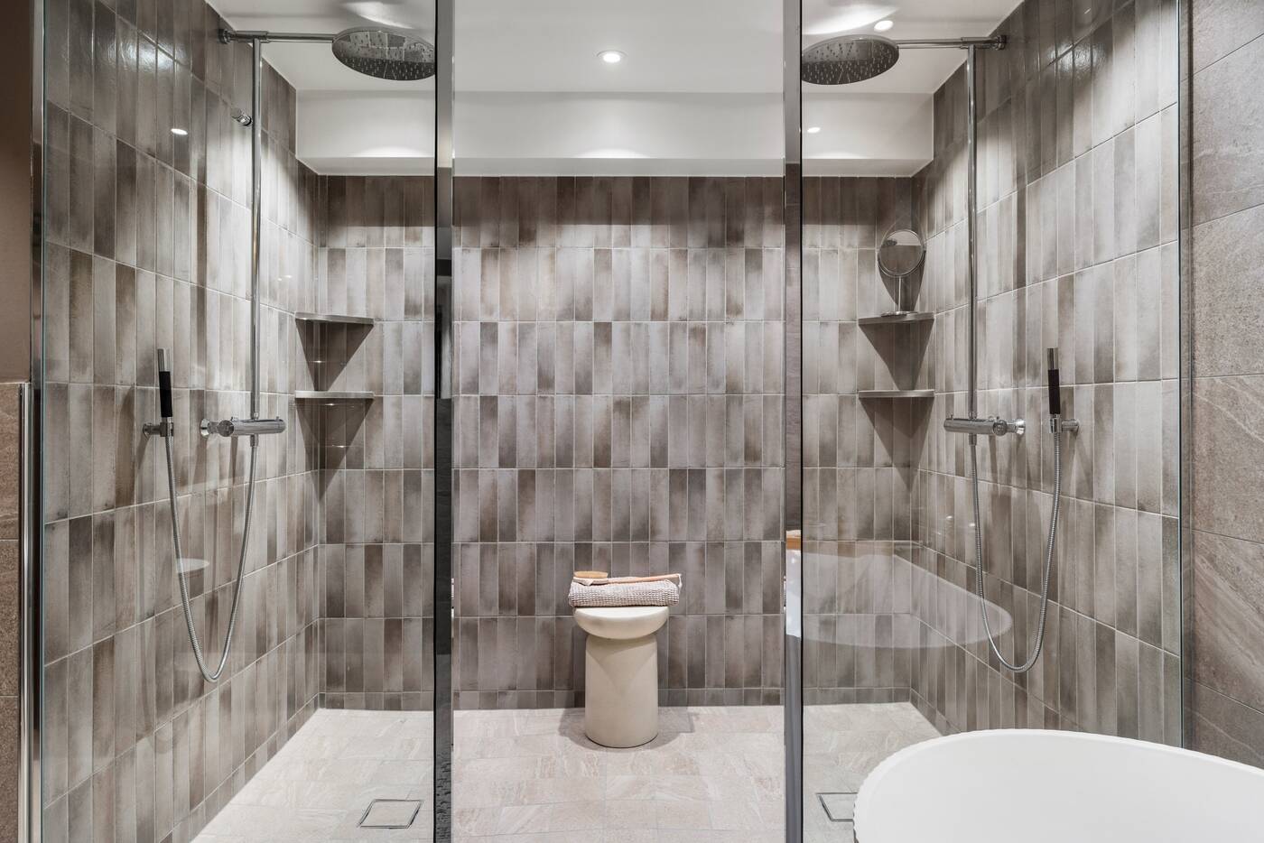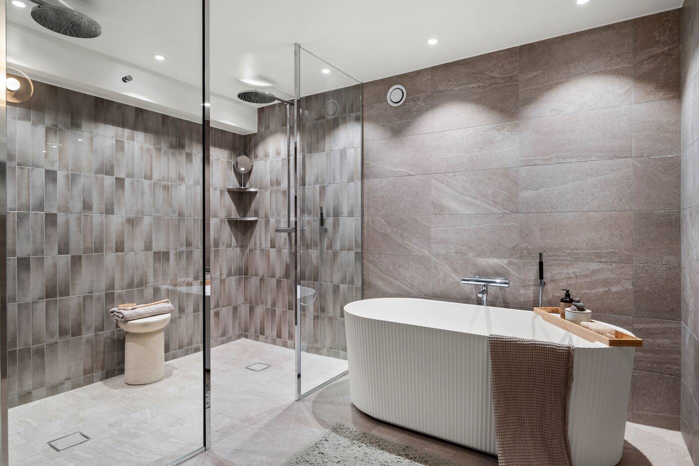 Fantastiskt helkaklat badrum utöver det vanliga. Badrummet är utrustat med WC, handfat med kommod samt spegel ovan. I detta badrum finns en stor pampig dubbeldusch och ett badkar.