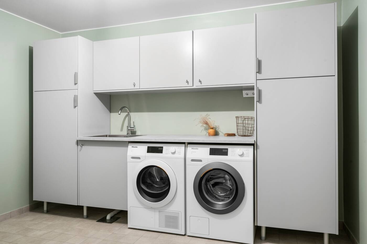 Praktisk och rymlig tvättstuga utrustad med tvättmaskin och torktumlare. Det finns gott om arbetsyta och förvaring.