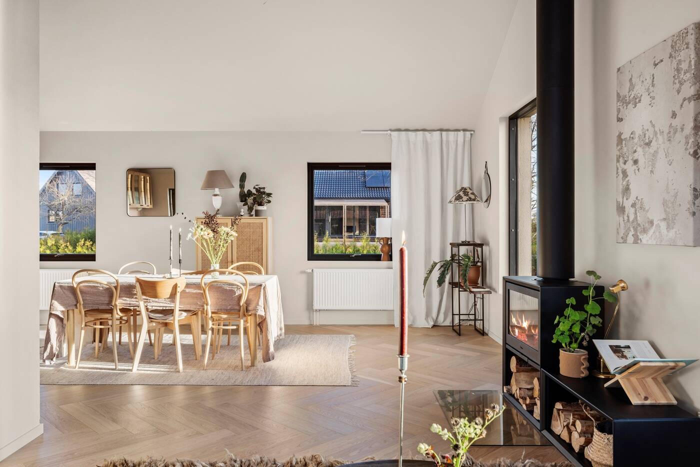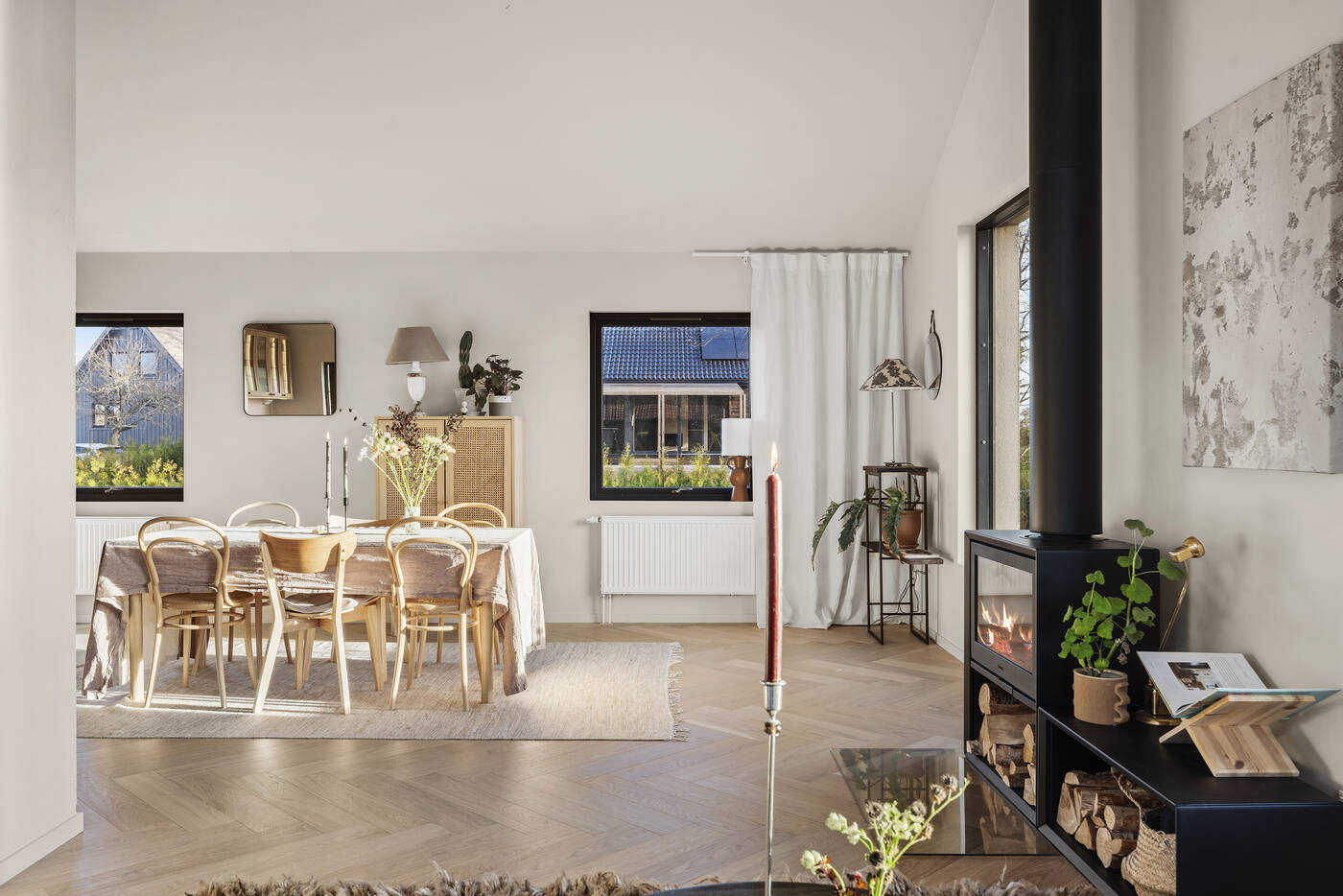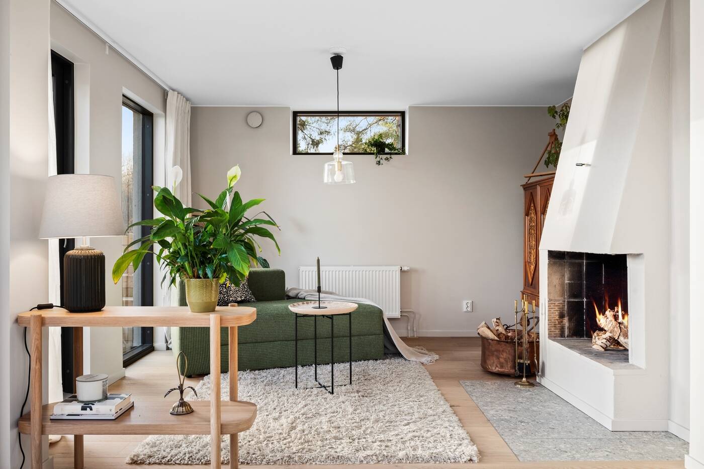 Fantastiskt socialt sovrum i öppen anslutning med köket. Här är det trevligt att umgås med sitt sällskap samtidigt som maten tillagas. Vardagsrummet erbjuder rymligt med utrymme för en stor soffgrupp och övrig möblering. En härlig öppen spis pryder rummet väl och är mysig att elda i under kalla höst- och vinterdagar.