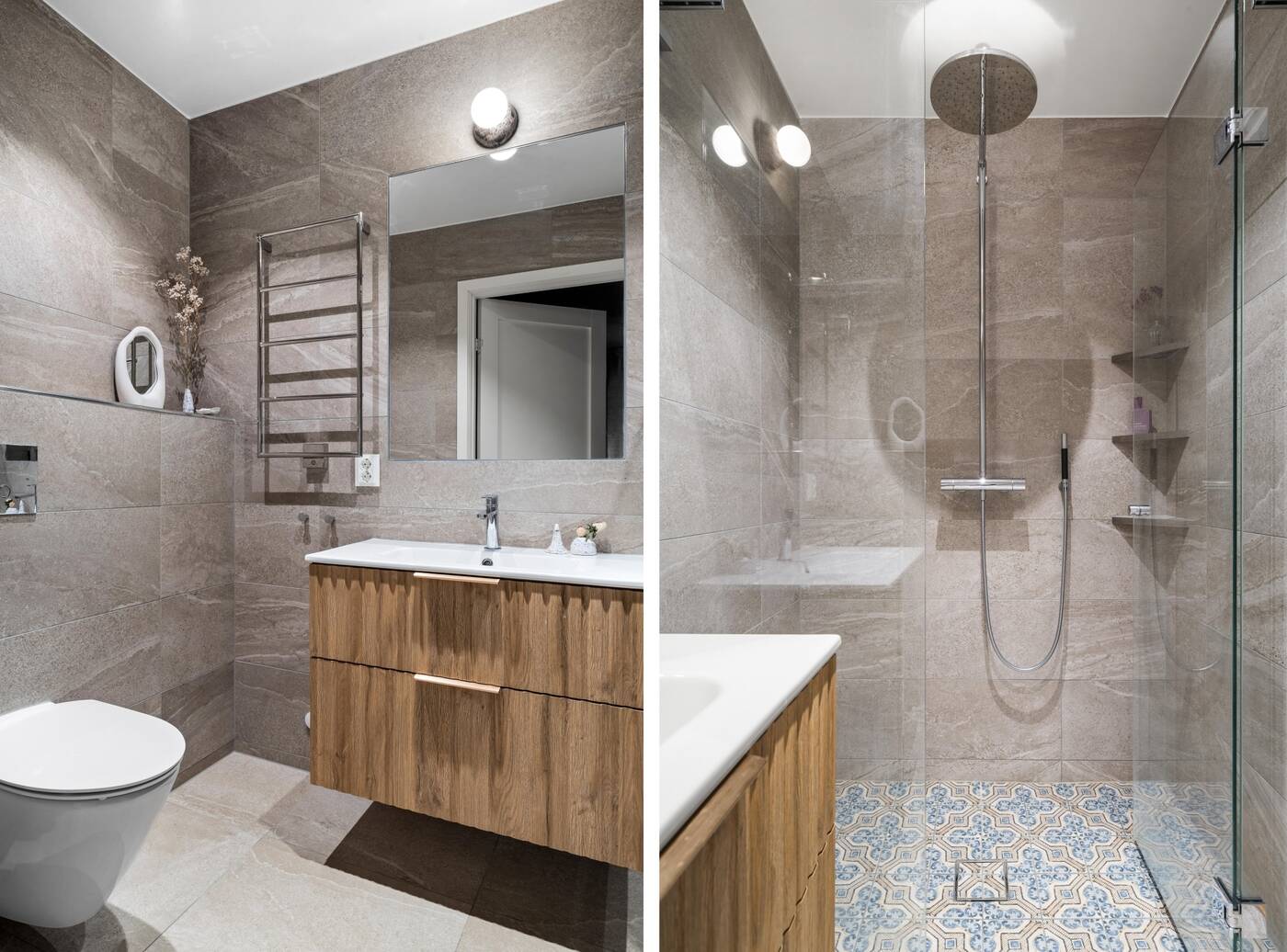Helkaklat modernt badrum utrustat med WC, dusch, handfat samt spegel ovan.