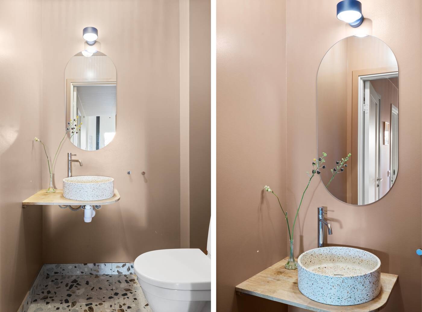 Invid hallen finns denna gäst-WC med handfat samt spegel ovan.
