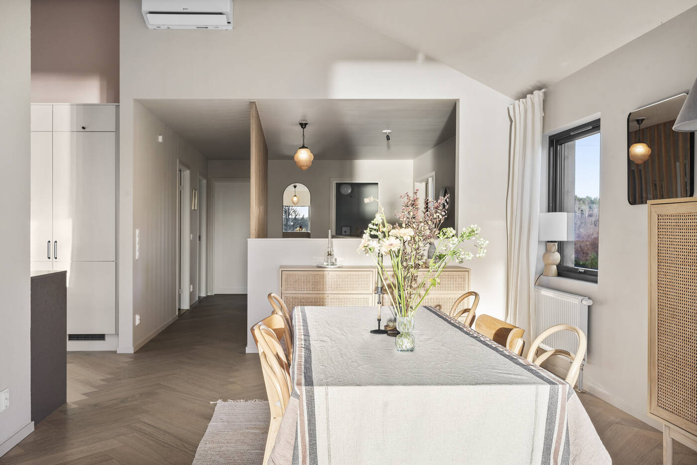 Inbjudande och rymlig matplats med utrymme för en stor matgrupp, här kan man bekvämt slå sig ner och avnjuta sina måltider med familj och vänner.