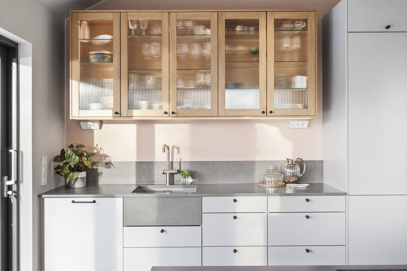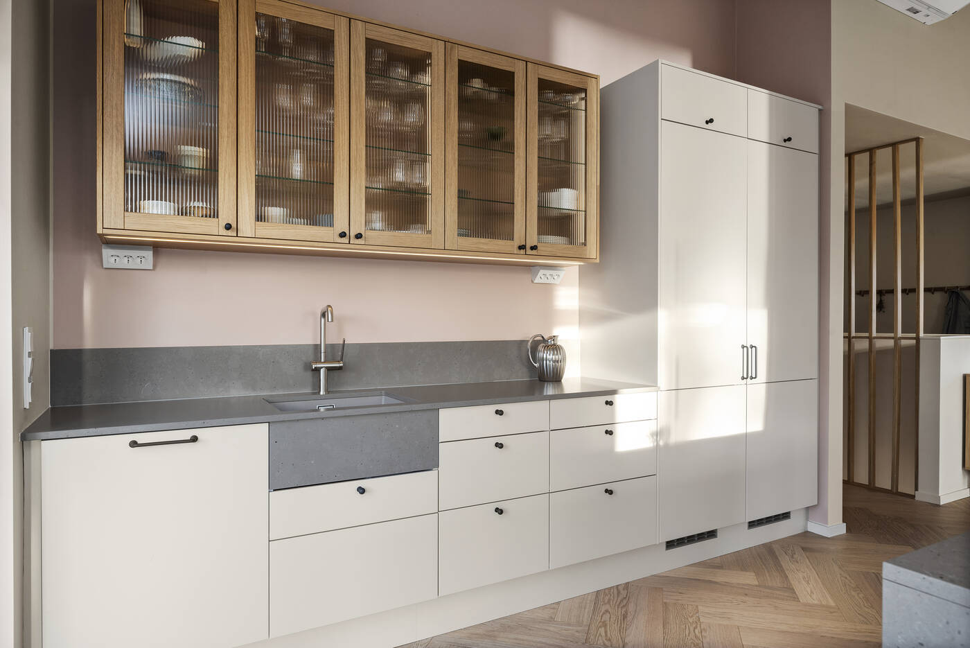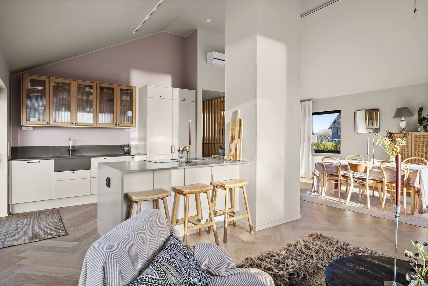 Smakfullt tilltaget ljust kök utrustat med kyl och frys, diskmaskin, ugn, mikrovågsugn, spishäll med inbyggd fläkt. Köket erbjuder gott om utrymme för köksförvaring samt arbetsyta för både matlagning och bakning. Vid köksön finns även tre sittplatser, här kan man slå sig ner och avnjuta sin frukost.