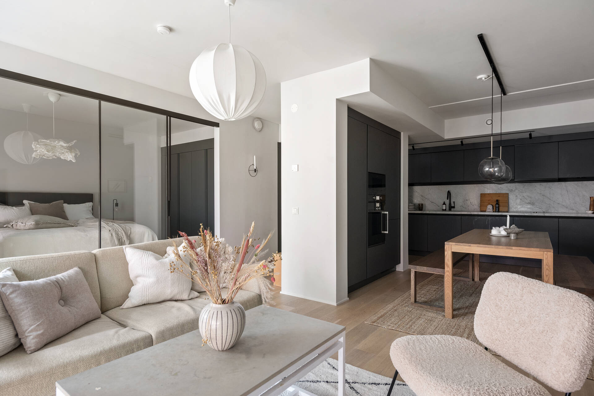 Den interiöra basen i bostäderna består av enstavigt, vitvaxat plankgolv, ljusgråa väggar och en vacker midnattsblå nyans i kök och garderober samt stora glaspartier från golv upp till 2,1 meter. I de mindre lägenheterna (Junior suites) finns stilrena skjutdörrspartier i smide och glas som skapar ett sovrum i rummet.